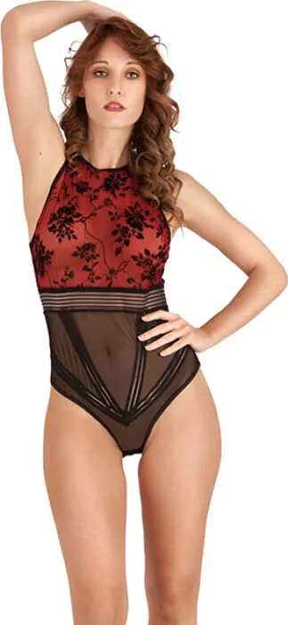 To body łączy subtelną zmysłowość z użytkowością — uszyte z przezroczystego tiulu z motywem kwiatowym, w kontrastujących kolorach czarnym i czerwonym. Ma zakryty dekolt, szerokie ramiączka i zapięcie przy karku; z tyłu pojawia się półotwarta konstrukcja z owalnym wycięciem. Pod biustem biegną delikatne, przezroczyste linie w kształcie litery V, które optycznie modelują sylwetkę, a pośladki pozostają przykryte tiulem. Producent podkreśla, że projekt pozwala też na noszenie jako elementu garderoby — świetnie komponuje się ze spódnicą lub dopasowanymi spodniami.