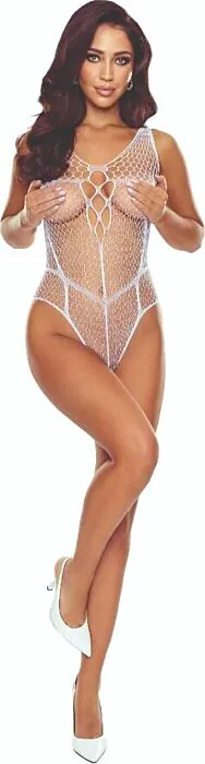 Zmysłowy bodystocking w kolorze białym, wykonany z elastycznego materiału łączącego poliamid i elastan. Doskonały na specjalne okazje lub intymne chwile.