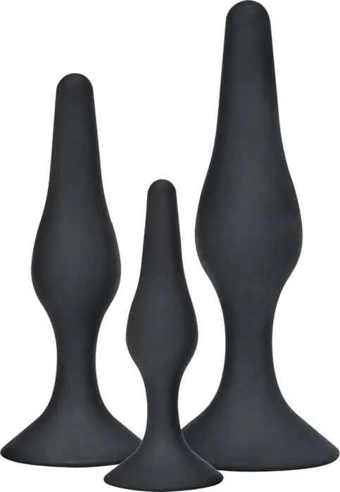 To zestaw trzech zakrzywionych plugów analnych wykonanych z jedwabistego silikonu medycznego — propozycja dla osób, które wolą stopniowe i kontrolowane wprowadzanie. Kształt jest ergonomiczny, co pomaga trafić w newralgiczne punkty bez konieczności forsowania. Dzięki trzem rozmiarom możesz zacząć od bardzo smukłego S i przechodzić dalej w swoim tempie, a szeroka podstawa zapobiega przypadkowemu wsunięciu.