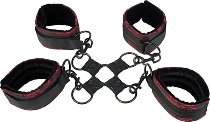 To są kajdanki typu hog tie — przeznaczone do bezpiecznego i wygodnego przytrzymania, nie do zawieszeń ani ekstremalnych obciążeń. Jeśli chcesz spróbować lekkiego bondage w domowych warunkach, ten zestaw sprawdzi się dobrze: mankiety są miękkie, regulowane i szybko zapiąć je na rzep. Charakterystyczny brokatowy materiał w czerwieni i czerni dodaje elegancji, a centralny łącznik z obrotowym O-ringiem daje swobodę zmiany pozycji bez konieczności rozpinania wszystkiego.