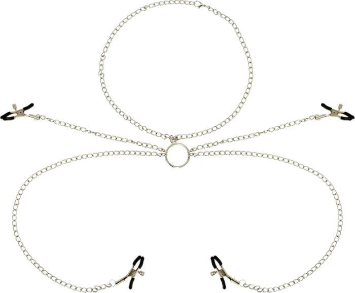 Intensyfikacja doznań podczas zabawy w BDSM z pinzasami do sutków OHMAMA FETISH, które wykonano z metalu bez niklu. Łańcuszki połączone z czterema pinzami dają nowe możliwości dla twoich erogennych stref. Łatwy w czyszczeniu materiał sprawia, że jest to idealny wybór dla osób dbających o higienę.