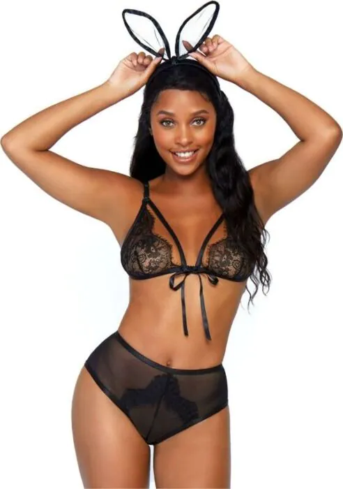 To klasyczny komplet „króliczka” od Leg Avenue — trzy elementy, które działają jako kompletna stylizacja: koronkowy top z ramiączkami, majtki z wycięciem z tyłu ozdobione puszystym ogonkiem oraz opaska z uszami. Produkt przeznaczony dla osób, które chcą dodać do gry wstępnej zabawny, prowokujący akcent bez skomplikowanej konstrukcji bielizny.