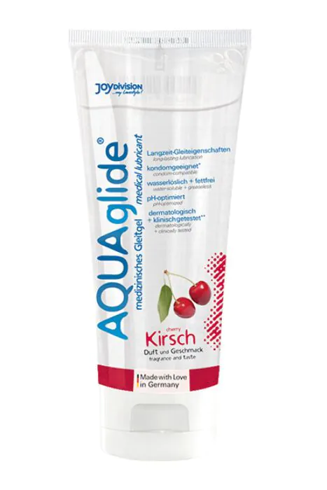 Wodny lubrykant JOYDIVISION AQUAGLIDE 100 ml — delikatny dla skóry, klinicznie testowany i w 100% kompatybilny z prezerwatywami. Ma przyjemny aromat malinowy i smak wiśniowy, nie zawiera tłuszczów i łatwo się zmywa. Dobra opcja do zabaw solo, z partnerem lub jako uzupełnienie do zabawek erotycznych.