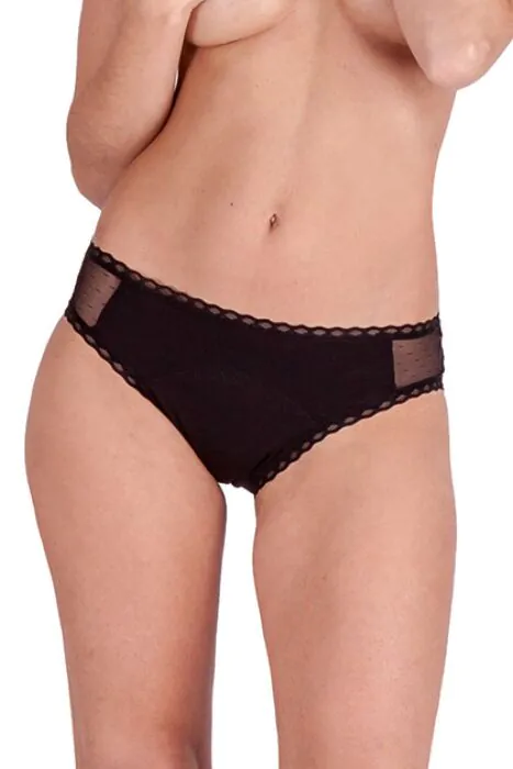 To klasyczne majtki menstruacyjne zaprojektowane z myślą o codziennym komforcie. Mają dyskretny, elastyczny krój i ozdobne prześwity na bokach — wyglądają jak zwykła bielizna, a jednocześnie mają wbudowane wzmocnienie od strefy intymnej aż do odcinka lędźwiowego, które stabilizuje pochłaniającą część i poprawia dopasowanie podczas ruchu.