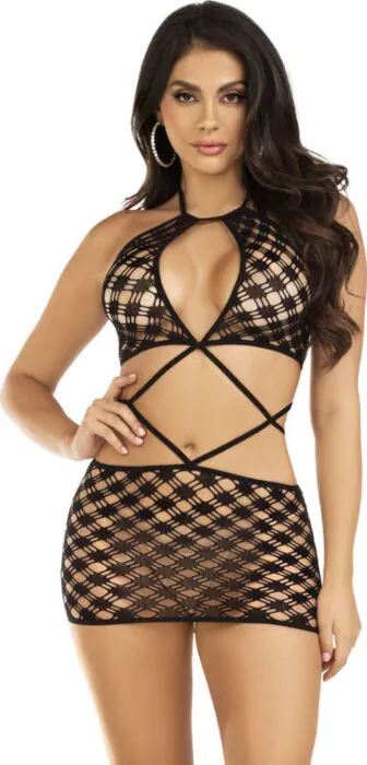 Sukienka z elastycznej siateczki, która podkreśla kobiece kształty. Idealna dla odważnych, które chcą wyrazić swój styl w sypialni lub przy basenie.