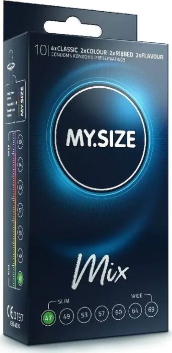 Zestaw 10 prezerwatyw MY SIZE MIX o szerokości 47 mm, w 4 wariantach. Wybierz spośród klasycznych, akanalowanych, smakowych i kolorowych.