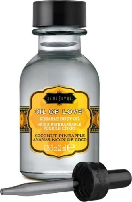 Mały, smakowy olejek „kissable” KAMASUTRA — nie jest olejem do masażu ani lubrykantem. Na bazie wody, z intensywnym smakiem kokosa i ananasa oraz efektem rozgrzewającym. Butelka 22 ml z aplikatorem, poręczna i dyskretna, dla par chcących urozmaicić pocałunki i pieszczoty oralne.