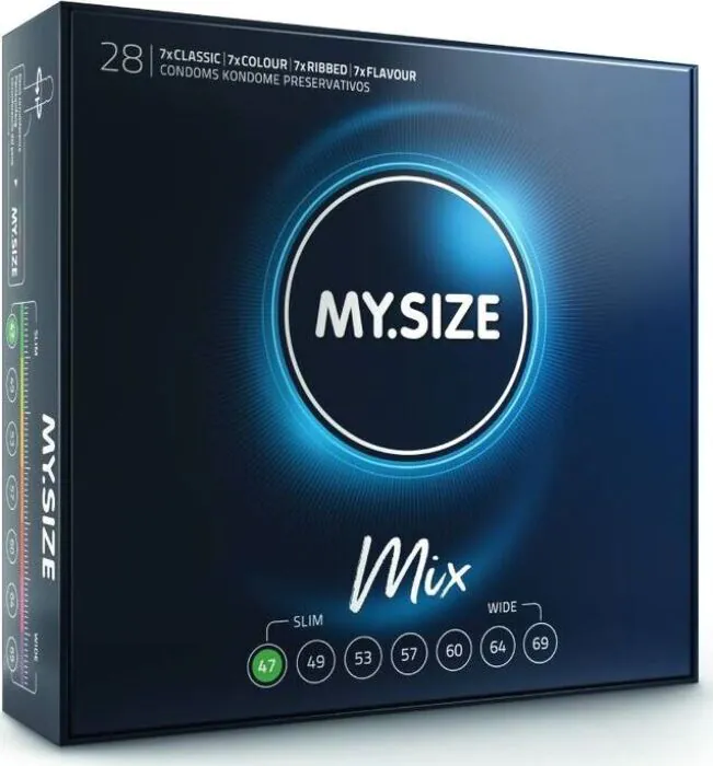 Zestaw prezerwatyw MY SIZE MIX 47 MM to 28 sztuk w czterech wariantach: Classic, Ribbed, Flavour i Colour. Hipoalergiczne, ultracienkie i 100% wegańskie.