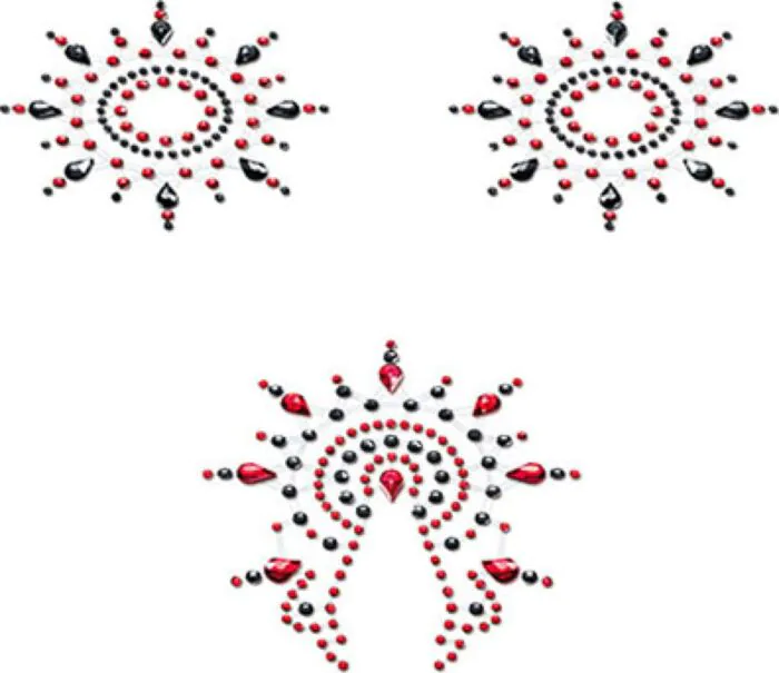 To dekoracje do ciała wykonane z kryształów, zaprojektowane specjalnie do ozdabiania biustu oraz okolic łona. Zestaw zawiera trzy elementy w kolorze Black/Red z ponad 300 drobnymi kamieniami — ich zadaniem jest dodać blasku i przyciągnąć uwagę podczas występu, sesji zdjęciowej lub w czasie intymnej stylizacji bielizny. Są przeznaczone do noszenia zarówno pod bielizną, jak i na wierzchu.