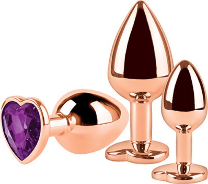 To komplet trzech plugów analnych wykonanych z metalu w eleganckim wykończeniu brązowym. Każdy ma tę samą, smukłą formę z lekko stożkową końcówką, dzięki czemu wprowadzanie jest płynne, a wielkości pozwalają na stopniową progresję. Baza jest płaska i umożliwia pewny chwyt, dodatkowo wykończona ozdobą w kształcie serca z kamieniem, co ułatwia operowanie zabawką i dodaje estetyki. Metal daje też możliwość zabaw temperaturą — schłodzony lub lekko ogrzany może dać inne doznania.