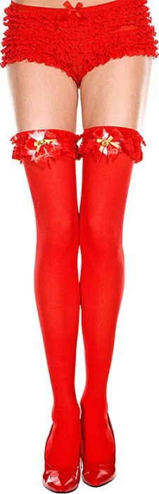 Kryjące pończochy od Music Legs ozdobione kokardą i małym dzwoneczkiem przy krawędzi paska. Propozycja dla tych, którzy szukają sezonowego, dekoracyjnego dodatku — do sesji, kolacji czy zabawnego akcentu świątecznego. Jeśli chcesz pończoch na codzienne, intensywne noszenie, wybierz modele bez ozdób. Dostępne w sklepie erotycznym jako lekka i efektowna opcja.