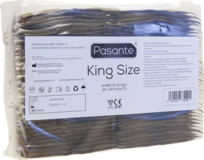 Pasante King Size to przezroczysta, gładka prezerwatywa z lateksu o zwiększonej szerokości nominalnej 60 mm. Lubrykovana bez spermicydów i z klasycznym zbiorniczkiem — dobry wybór, jeśli standardowe rozmiary są za ciasne. Wygodne dopasowanie i prosty kształt sprawiają, że to praktyczna opcja dla osób szukających większego komfortu podczas stosunku.
