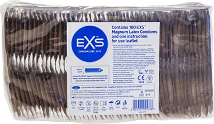 Exs Magnum Large to opakowanie 100 prezerwatyw zaprojektowanych z myślą o osobach, które potrzebują szerszego dopasowania. Wykonane z naturalnego lateksu, z fabrycznym lubrykantem silikonowym i zbiorniczkiem, zapewniają pewniejsze i bardziej komfortowe dopasowanie niż standardowe rozmiary. Sprawdzą się, gdy zwykłe prezerwatywy są zbyt ciasne.