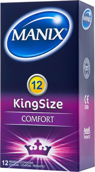 Manix King Size to większe prezerwatywy z naturalnego lateksu — nominalna szerokość 56 mm daje dodatkową przestrzeń u nasady i w części głównej. Lubrykant wstępny i delikatny zapach wanilii poprawiają komfort. Dla osób, które szukają pewniejszego, bardziej komfortowego dopasowania niż standardowe rozmiary.
