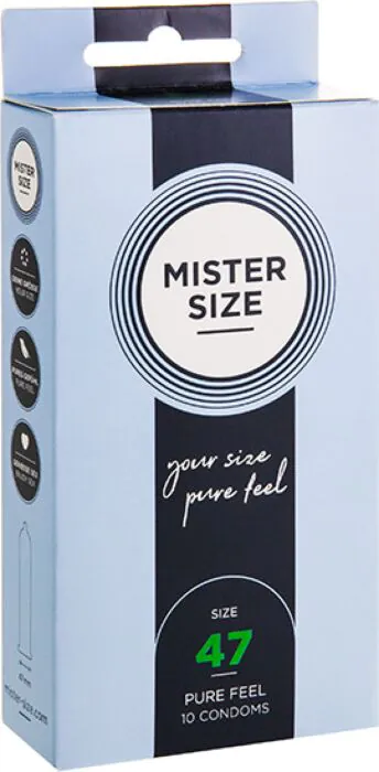 MISTER SIZE 47 mm to świetne rozwiązanie dla mężczyzn, którzy potrzebują prezerwatyw o mniejszym rozmiarze. Ultrafina struktura zapewnia wyjątkowe doznania, ale pamiętaj, że są one przeznaczone wyłącznie dla wąskich penisów.