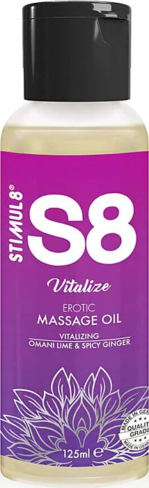 S8 Vitalize to olejek do masażu od STIMUL8 z mieszanką trzech olejów (jojoba, migdał, sezam) wzbogacony witaminami i minerałami. Ma świeży zapach limonki z nutą imbiru, jest przebadany pod kątem alergii i wolny od parabenów oraz cukru. Dobry wybór dla par i osób szukających odżywczego, aromatycznego olejku w poręcznym opakowaniu.