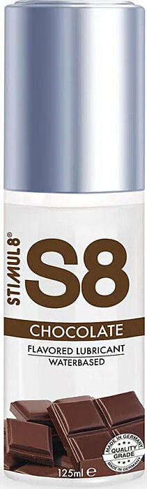 Smakowy lubrykant STIMUL8 S8 o smaku czekolady — produkt na bazie wody stworzony dla par i osób, które chcą połączyć nawilżenie z przyjemnym smakiem. Formuła bez parabenów, ftalanów i barwników, łatwa do zmycia i przyjazna dla skóry. Dobra relacja jakości do ceny dla codziennego użycia i zabaw ustnych.