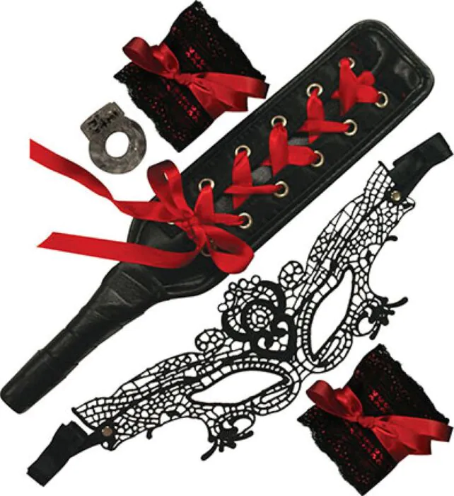 Intensywne doznania i zmysłowy design z koronką sprawiają, że ten zestaw jest idealny do wprowadzenia w świat bondage. Zawiera eleganckie akcesoria, takie jak czarne kajdanki z czerwonymi wstążkami, maskę i paletę, które wprowadzą powiew ekscytacji do każdej sypialni.