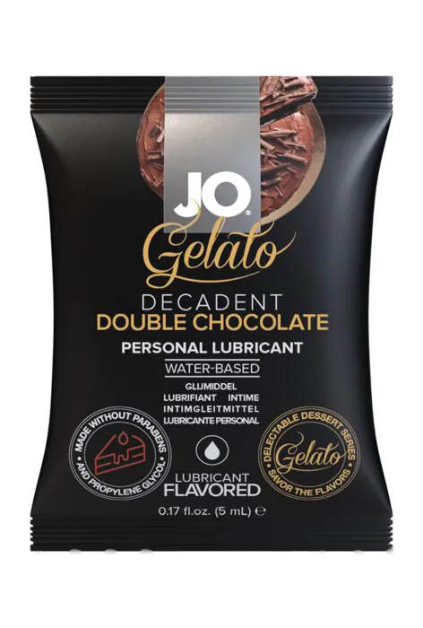 Mała saszetka lubrykantu System JO Gelato Double Chocolate — woda + smak mlecznej i gorzkiej czekolady. Jednorazowe opakowanie 5 ml świetne na wyjazd i do zabaw oralnych. Dla osób, które chcą spróbować smakowego żelu bez zobowiązań i bez dodatku cukru.
